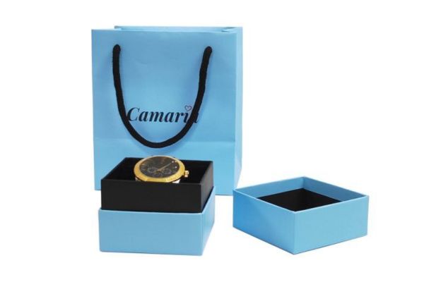 Túi giấy có quai ruy băng hoặc dây dù: tăng tính thẩm mỹ và độ chắc chắn khi đựng hộp đồng hồ nặng.