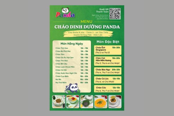 Mẫu menu cháo dinh dưỡng không chỉ là bảng danh sách món ăn mà còn là yếu tố thể hiện phong cách và sự chuyên nghiệp của quán. Một menu được thiết kế đẹp, rõ ràng và khoa học giúp khách hàng dễ lựa chọn, đồng thời tạo thiện cảm ngay từ cái nhìn đầu tiên. Với tông màu tươi sáng, hình ảnh món cháo sinh động, mẫu menu góp phần nâng cao giá trị thương hiệu. Đây chính là công cụ giúp quán cháo dinh dưỡng thu hút khách hàng và tăng doanh thu hiệu quả.