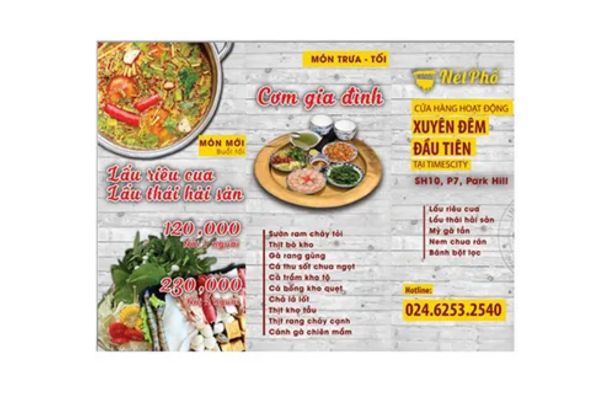 Menu để bàn hoặc treo tường: hiển thị món nổi bật, thu hút ánh nhìn khách hàng.