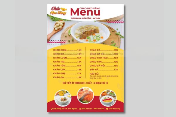 Một mẫu menu cháo dinh dưỡng được in ấn đúng kỹ thuật không chỉ đẹp mắt mà còn thể hiện sự chăm chút của chủ quán đối với khách hàng.