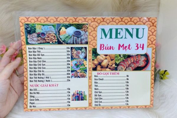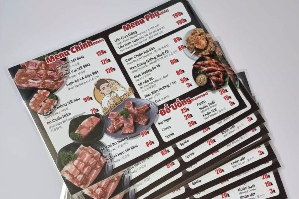 • Menu 1 tờ ép plastic: Phù hợp quán ăn nhỏ, quán nhậu, quán cơm bình dân.