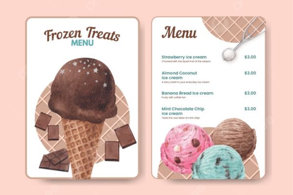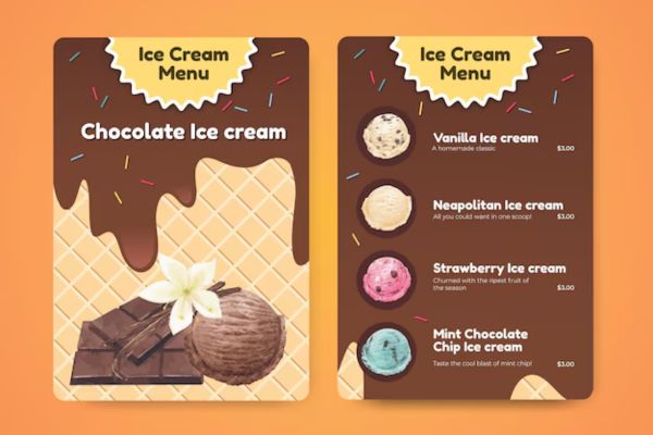 Menu là công cụ giao tiếp trực tiếp giữa quán và khách hàng. Một mẫu menu quán kem được thiết kế khoa học, dễ nhìn giúp khách hàng nhanh chóng lựa chọn món kem yêu thích, đồng thời thể hiện rõ phong cách của quán – trẻ trung, sang trọng hay dễ thương.